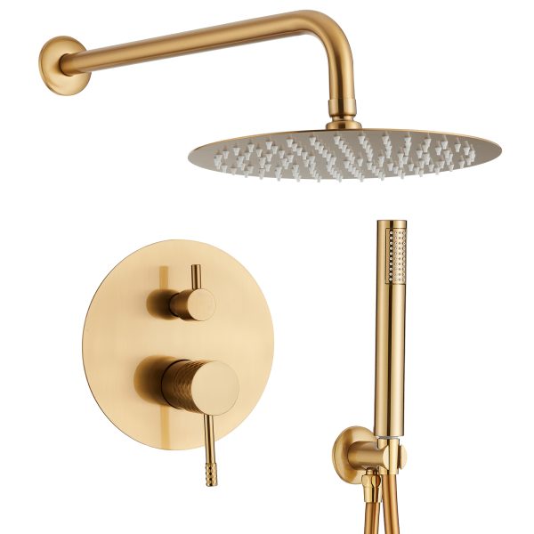 VALAZ Ducha empotrada monomando redonda acabado maneta luxury dorado cepillado a pared – Serie Ofin – 25cm