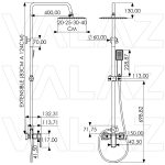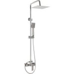 Incluye: Rociador disponible en tamaño 20, 25, 30 y 40 cm, barra extensible de 80cm a 120 cm, cuerpo de la grifería con cartucho y maneta cuadrada, flexo y alcachofa de mano