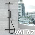 VALAZ Barra de ducha termostática cuadrada ajustable hasta 120CM negro mate – Serie Segura – 40cm