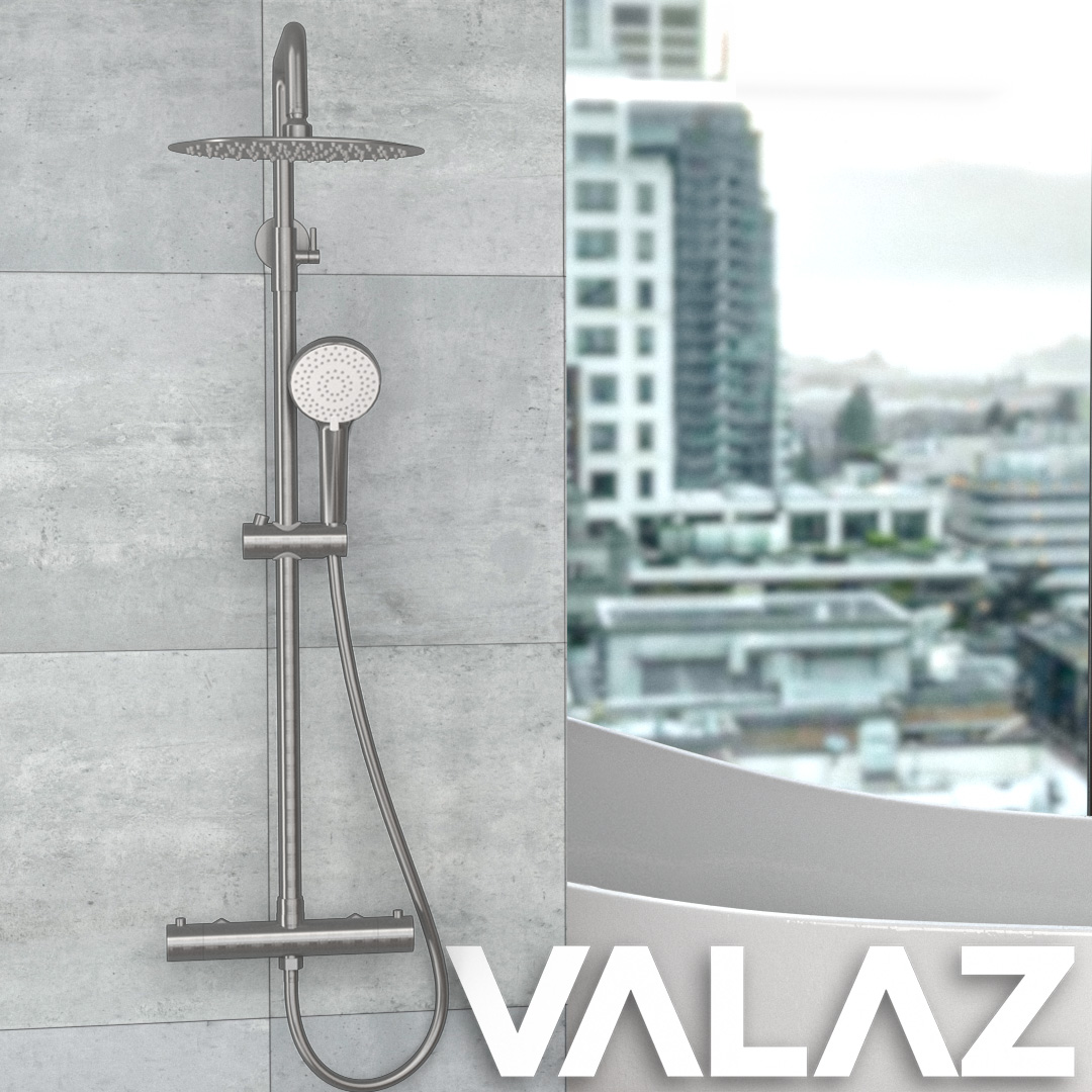 VALAZ Barra de ducha termostática redonda ajustable hasta 120CM acero cepillado – Serie Ebro – 25cm