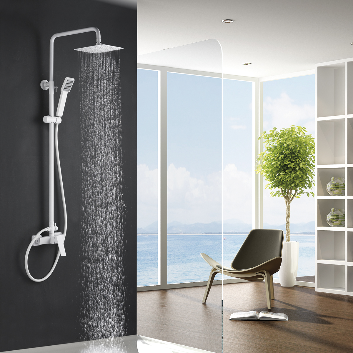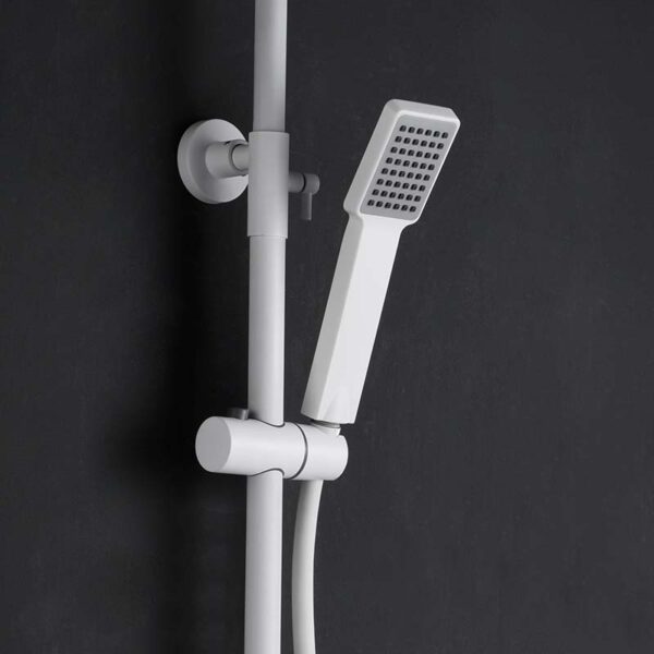 Conjunto de ducha monomando serie ART, barra de ducha extensible, cuerpo de la griferia de latón, rociador extraplano Ø20 y antical, cartucho cerámico Ø 35mm, incluye flexo y mango. Acabado blanco mate.