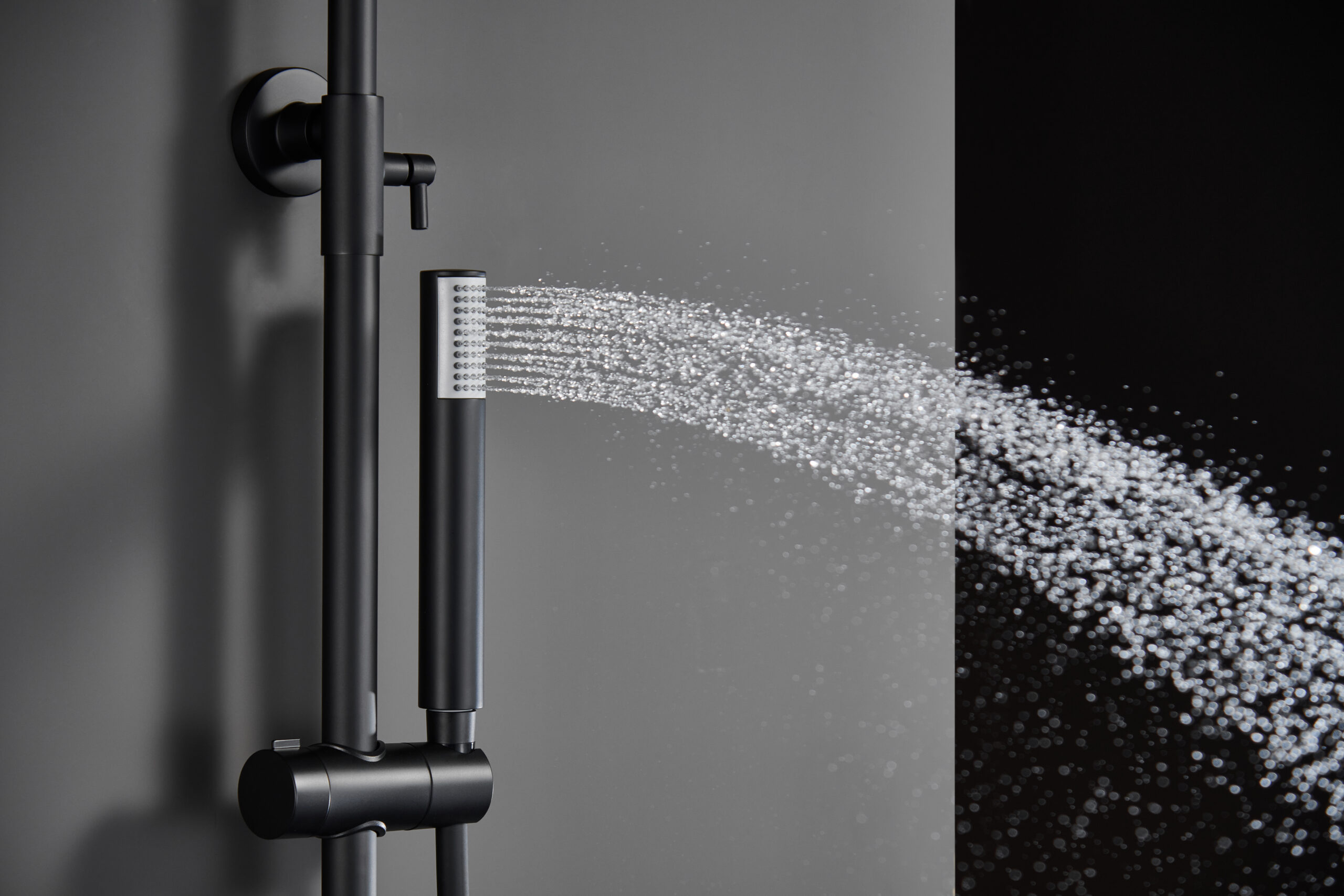Conjunto de ducha monomando serie MONZA, barra de ducha extensible, cuerpo de la griferia de latón, rociador extraplano Ø20 y antical, cartucho cerámico Ø 35mm, incluye flexo y mango. Acabado negro mate.