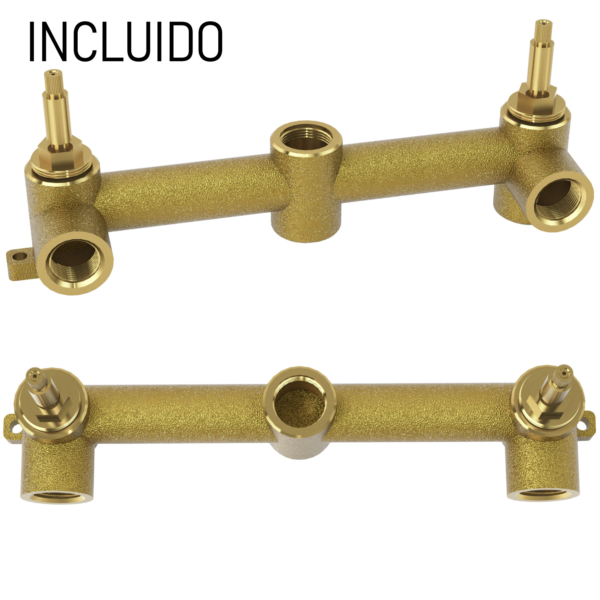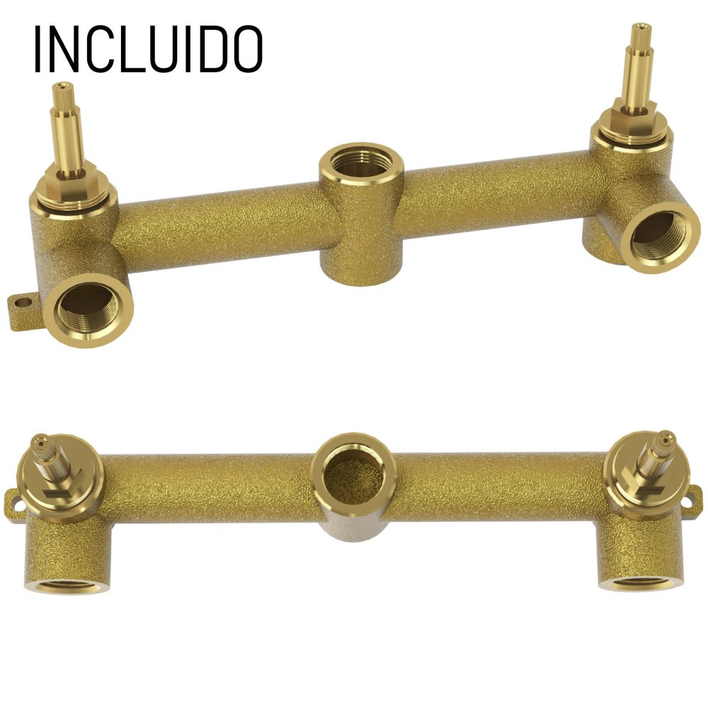 Incluye: rociador disponible en tamaño 20,25 y 30 con soporte a pared de 1 salida/vía (rociador efecto lluvia). Bimando de agua fría y caliente.