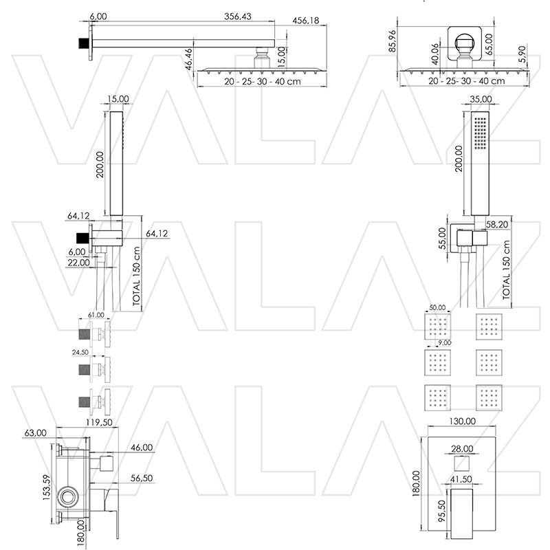 Incluye: Rociador disponible en tamaño 20×20, 25×25 y 30×30 con soporte a pared, monomando de 3 vías (rociador efecto lluvia ,alcachofa de mano y 6 jets) flexo de 150cm y alcachofa de mano con soporte.