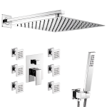 Materiales: Rociador de acero inoxidable, monomando de latón, alcachofa de mano de PVC ,flexo de acero inoxidable y 6 jets empotrados.