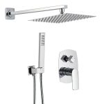 Incluye: Rociador disponible en tamaño 20×20, 25×25 y 30×30 con soporte a pared, monomando de 2 vías (rociador efecto lluvia y alcachofa de mano) flexo de 150cm y alcachofa de mano con soporte.