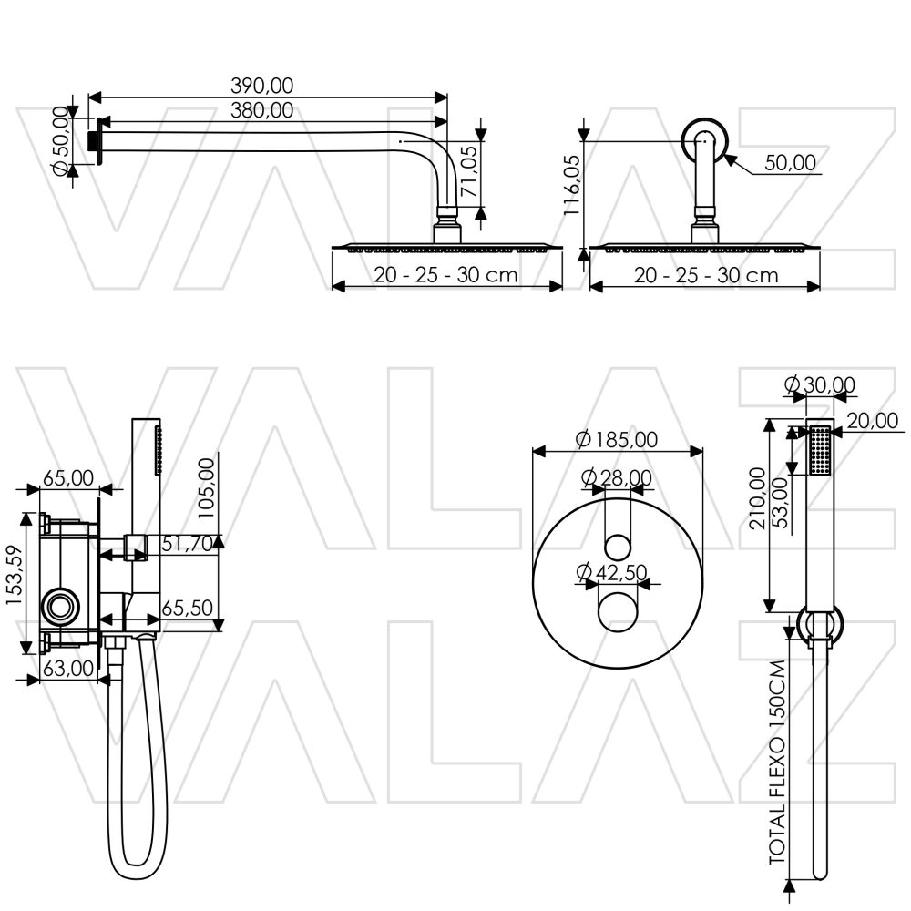Incluye: Rociador disponible en tamaño 20, 25 y 30 con soporte a pared, monomando de 2 vías (rociador efecto lluvia y alcachofa de mano) flexo de 150cm y alcachofa de mano con soporte.