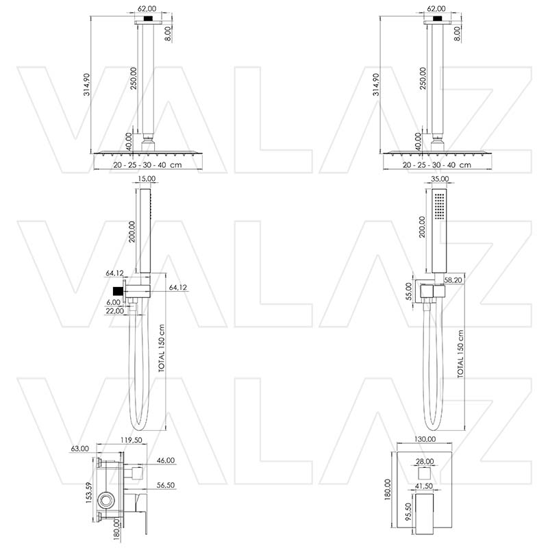 Incluye: Rociador disponible en tamaño 20×20, 25×25 ,30×30 con soporte techo monomando de 2 vías (rociador efecto lluvia y alcachofa de mano) flexo de 150cm y alcachofa de mano con soporte.