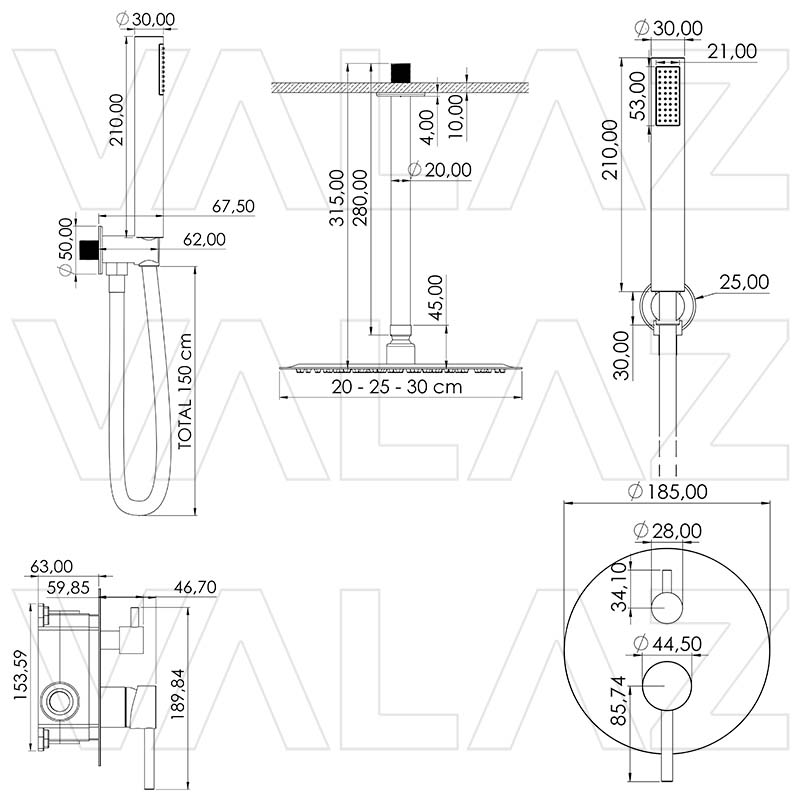 Incluye: Rociador disponible en tamaño 20, 25 y 30 con soporte a techo, monomando de 2 vías (rociador efecto lluvia y alcachofa de mano) flexo de 150cm y alcachofa de mano con soporte.