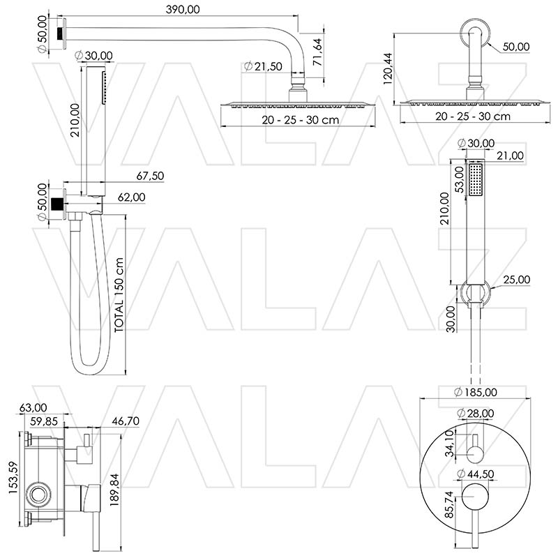 Incluye: Rociador disponible en tamaño 20, 25 y 30 con soporte a pared, monomando de 2 vías (rociador efecto lluvia y alcachofa de mano) flexo de 150cm y alcachofa de mano con soport