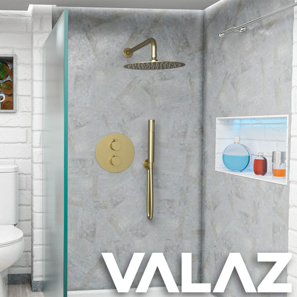 VALAZ Ducha empotrada termostática a pared redonda dorado cepillado – Serie Jucar – 20cm