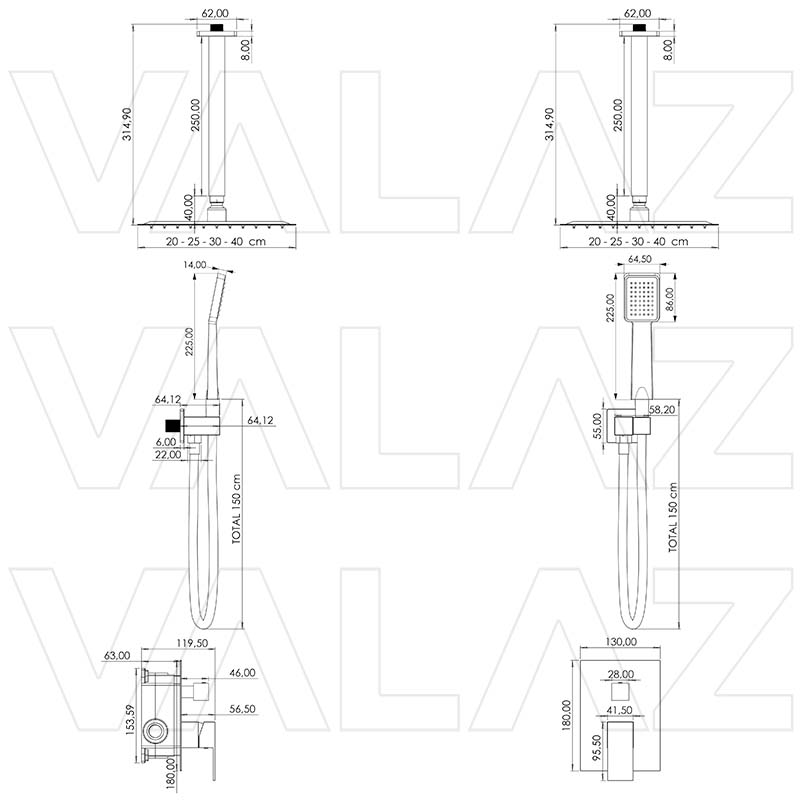 Incluye: Rociador disponible en tamaño 20×20 , 25×25 y 30×30 con soporte a techo, termostática de 2 vías (rociador efecto lluvia y alcachofa de mano) flexo de 150cm y alcachofa de mano con soporte.