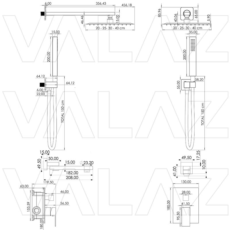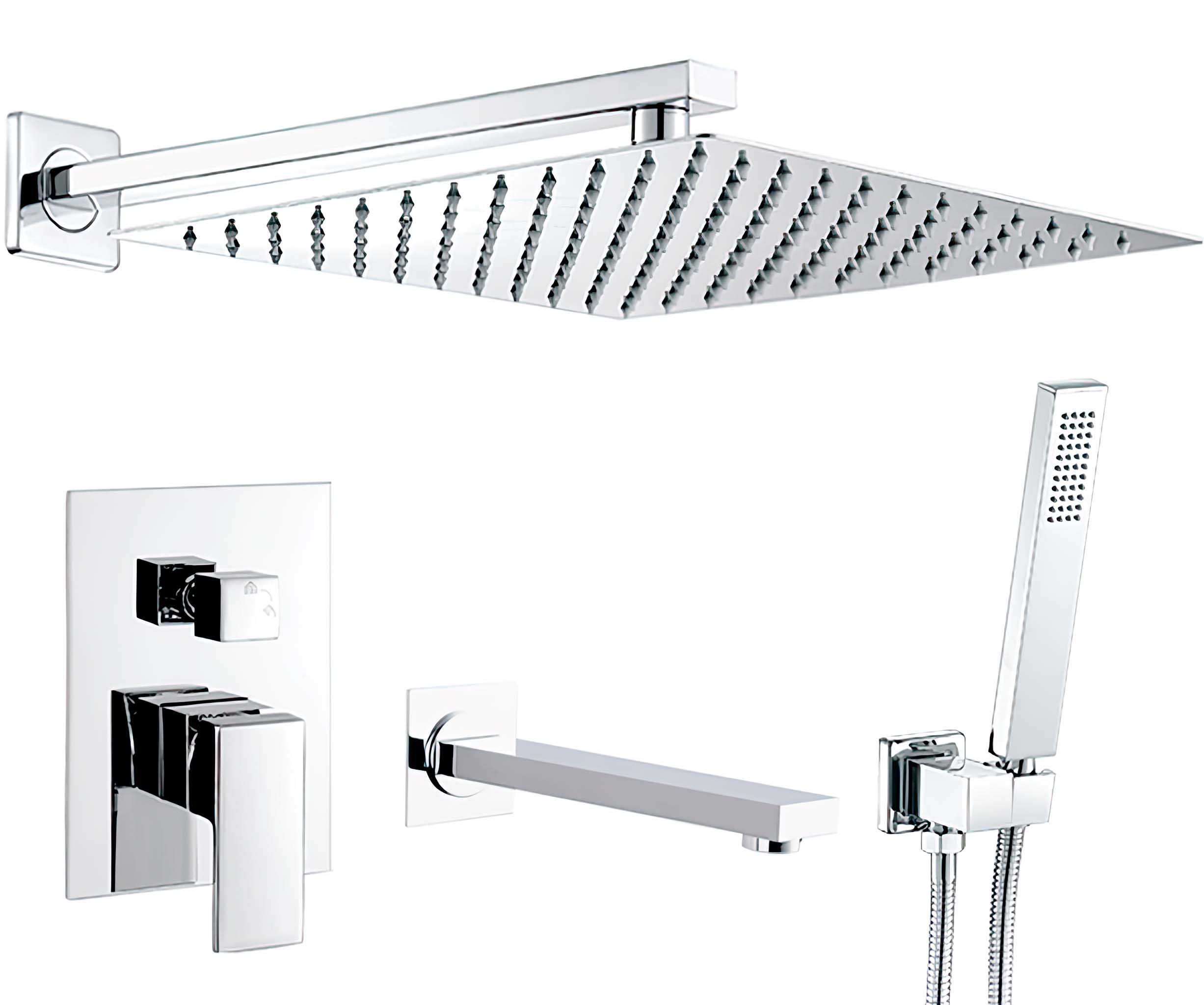 Incluye: Rociador disponible en 20×20, 25×25, 30×30, 40×40 con soporte a pared, monomando de 3 vías ( rociador efecto lluvia, alcachofa de mano y caño de bañera), flexo de 150 cm y alcachofa de mano con soporte.
