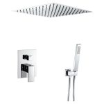 Incluye: Rociador disponible en tamaño 30×30 et 40×40 con premarco a techo, monomando de 2 vías ( rociador efecto lluvia y alcachofa de mano) flexo de 150cm y alcachofa de mano con soporte.