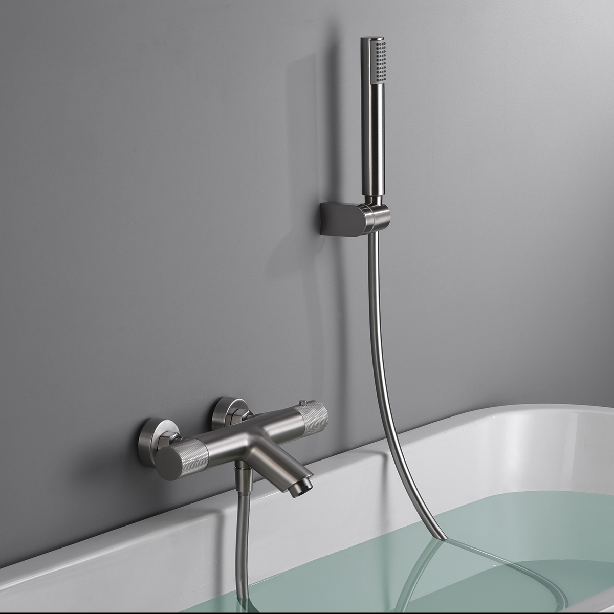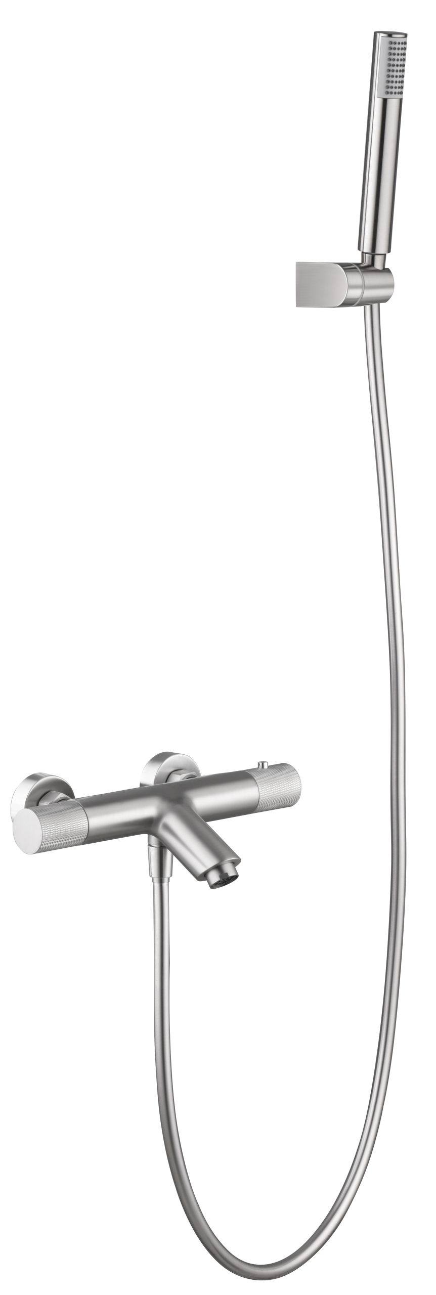 Kit baño/ducha serie LINE en acabado níquel cepillado, cuerpo de grifería de latón níquel cepillado, flexo de PVC, soporte para mango de ducha ABS, mango ducha redondo, cartucho termostátivo TURN CLEAN SYSTEM