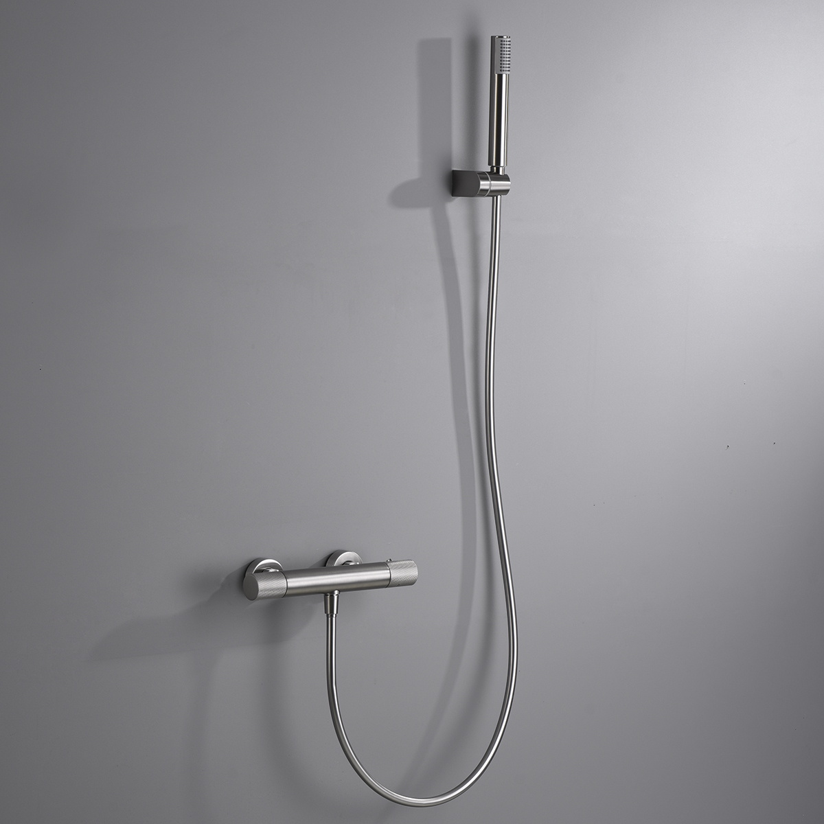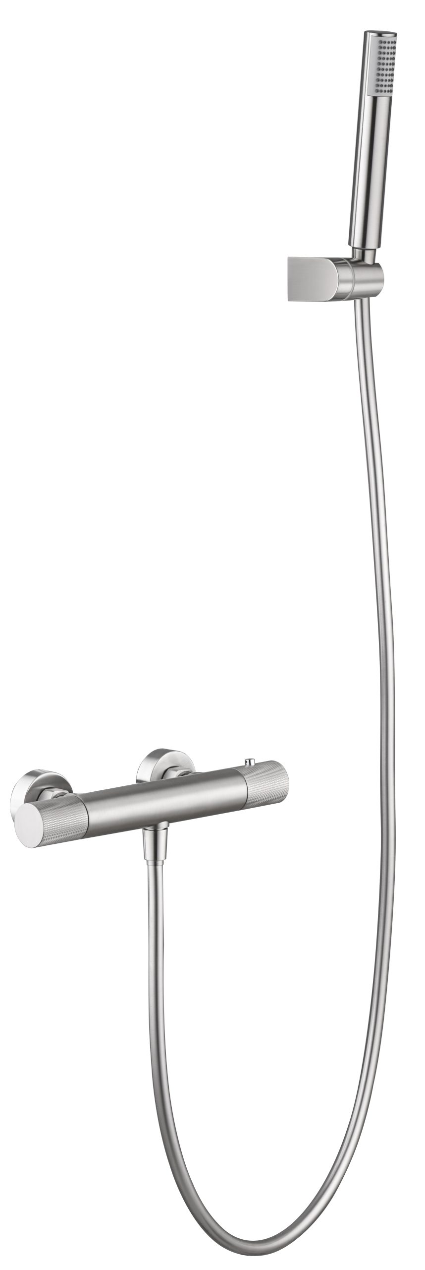 Kit ducha serie LINE en acabado níquel cepillado, cuerpo de grifería de latón níquel cepillado, flexo de PVC, soporte para mango de ducha ABS, mango ducha redondo, cartucho termostátivo TURN CLEAN SYSTEM.