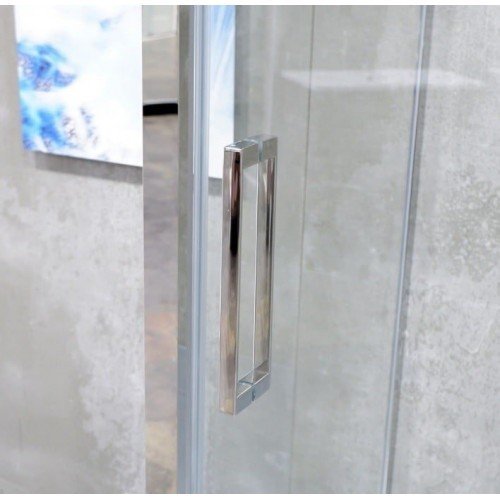 En formato angular se utiliza en espacios pequeños y medianos, donde necesitamos tener ambos lados con corredera y tener el máximo paso posible en corredero, además podemos entrar por el vértice de la mampara.