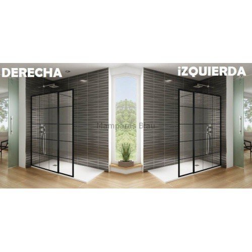 La mampara de ducha de una hoja fija más una hoja abatible, que abre dentro y fuera, Modelo Screen Black Chess Moving, con cuadros en negro mate, es una mampara top ventas muy utilizada, ya que tiene un diseño de los mas demandado, el borde de la mampara y los cuadros del vidrio son serigrafiados en fábrica, con el brazo a juego de hasta 120 cm y articulado por si queremos ponerlo a 45 grados para salvar ventanas, lleva un vidrio templado de seguridad de alta resistencia grosor 8 mm, tanto el fijo como el abatible, con perfiles con tratamiento especial contra el agua.