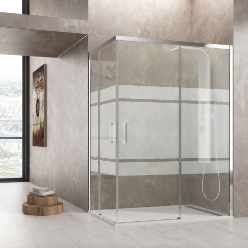 Este modelo tiene la posibilidad de elegir el vidrio con serigrafia, por si queremos más intimidad en nuestro baño, ya que tiene unas franjas vinílicas blancas, ya instaladas en fábrica.