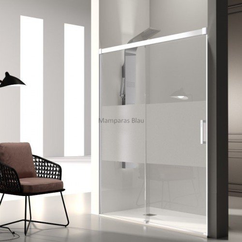 Esta mampara tiene la opción de elegir el vidrio transparente o con serigrafia que nos da más intimidad.