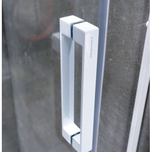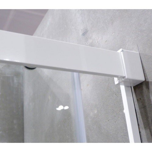 Mampara de ducha frontal con un fijo y una corredera. Modelo Glasé, este modelo de mampara se caracteriza por tener los perfiles estilo minimalista en blanco mate y por compensarse la medida por el perfil superior y el cruce de hojas.