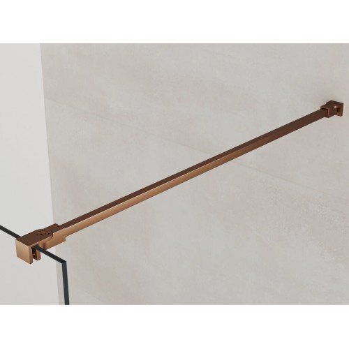 Mampara de ducha de una hoja fija modelo Screen en cobre cepillado, compuesta de un fijo de 8 mm, en este caso podemos elegir varios anchos tanto del fijo, el brazo es orientable (se puede poner por ejemplo a 45 grados) va de 60 a 120 cm.