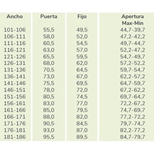 ANCHO de 101 a 106 ,ANCHO de 106 a 111 ,ANCHO de 111 a 116 ,ANCHO de 116 a 121 ,ANCHO de 121 a 126 ,ANCHO de 126 a 131 ,ANCHO de 131 a 136 ,ANCHO de 136 a 141 ,ANCHO de 141 a 146 ,ANCHO de 146 a 151 ,ANCHO de 151 a 156 ,ANCHO de 156 a 160 ,ANCHO de 161 a 166 ,ANCHO de 166 a 171 ,ANCHO de 171 a 176 ,ANCHO de 176 a 181 ,ANCHO de 181 a 186 |
