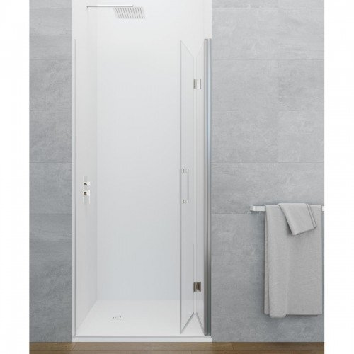 Mampara de ducha frontal plegable con 2 hojas modelo Glass combi 1, es una mampara que lleva bisagras entre las hojas o que evita un perfil, el perfil de la pared es abatible también, podemos abrir todo, plegable y moverla cómo queramos, el perfil esta provisto de un sistema de elevación al girar la hoja abatible, integrado en el perfil vertical, mediante el cual la puerta se eleva conforme la abrimos.