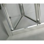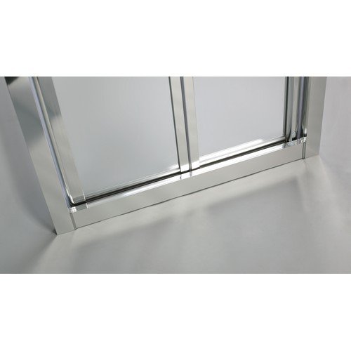 La mampara de ducha frontal, modelo Akord de GME, compuesta por dos hojas plegables en rail, es una mampara sencilla, toda perfilada en aluminio plata brillo, que destaca por su sistema de apertura plegable, lo cual nos permite un gran paso de entrada en mamparas de tamaño reducido.