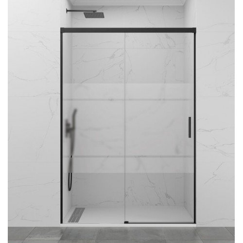 Mampara de ducha negra frontal en fijo y corredera. Modelo Basic, este modelo de mampara se caracteriza por tener los perfiles estilo minimalista en negro mate, por compensarse la medida por el perfil superior, lo que hace que los perfiles laterales sean muy delgados.