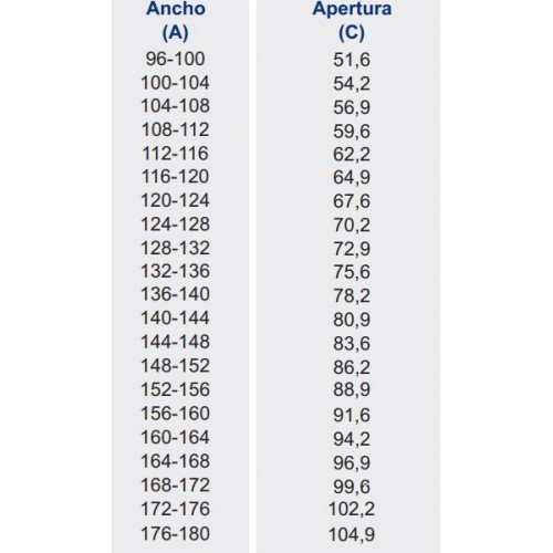 ANCHO de 100 a 104 ,ANCHO de 104 a 108 ,ANCHO de 108 a 112 ,ANCHO de 112 a 116 ,ANCHO de 116 a 120 ,ANCHO de 120 a 124 ,ANCHO de 124 a 128 ,ANCHO de 128 a 132 ,ANCHO de 132 a 136 ,ANCHO de 136 a 140 ,ANCHO de 140 a 144 ,ANCHO de 144 a 148 ,ANCHO de 148 a 152 ,ANCHO de 152 a 156 ,ANCHO de 156 a 160 ,ANCHO de 160 a 164 ,ANCHO de 164 a 168 ,ANCHO de 168 a 172 ,ANCHO de 172 a 176 ,ANCHO de 176 a 180 ,ANCHO de 96 a 100 |