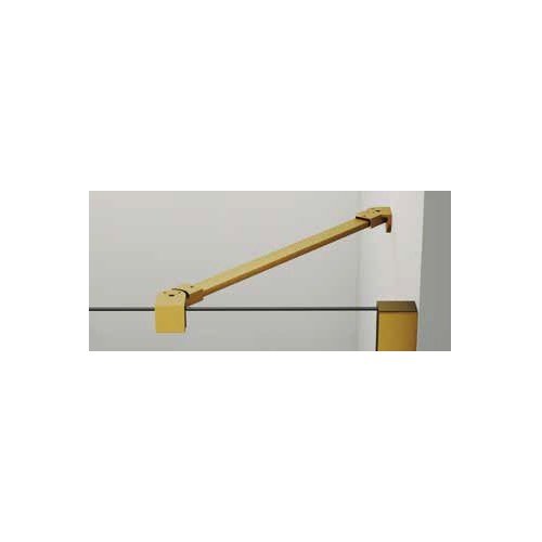 Mampara de ducha frontal con 1 hoja fija y una puerta abatible, modelo Glass Combi C, en color oro cepillado, es una mampara que lleva el fijo con un brazo a 45 grados hasta 60 cm en negro mate igual, o una barra paralela hasta 140 cm, entre el fijo y el abatible van unas bisagras de 90 grados, es decir solo abre hacia afuera.