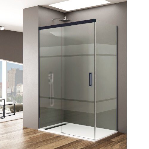 Mampara de ducha rectangular, frontal en fijo y corredera con lateral fijo. Modelo Basic rectangular negra, este modelo de mampara se caracteriza por tener los perfiles estilo minimalista en negro mate, por compensarse la medida por el perfil superior, lo que hace que los perfiles laterales sean muy delgados, en la parte inferior solo lleva un vierteaguas de 1 cm, de acero inoxidable, debajo de la puerta que junto con las gomas de estanqueidad hace que sea hermética al agua.