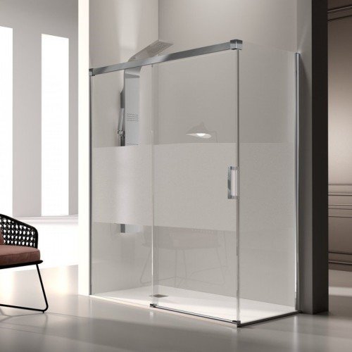 Esta mampara tiene la opción de elegir el vidrio transparente o con serigrafia que nos da más intimidad.