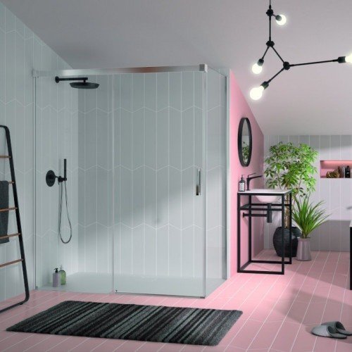 Mampara de ducha frontal con un fijo y una corredera más lateral fijo. Modelo Glasé GS103, este modelo de mampara se caracteriza por tener los perfiles estilo minimalista en plata brillo y por compensarse la medida por el perfil superior y el cruce de hojas.