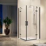 Mampara de ducha angular entrada vértice en negro mate, formada un fijo más abatible por cada lado que abren solo hacia fuera, los fijos llevan un brazo de estabilidad de 45 grados. Este modelo es ideal para cerrar ángulos, y queramos tener una apertura más grande que en modelos correderos. Gracias a las bisagras entre las hojas nos ahorramos mucho perfil y hace efecto más limpio.