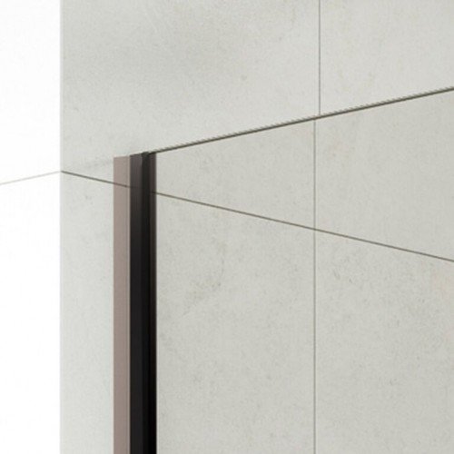 Mampara de ducha de una hoja fija más una puerta abatible, modelo Screen Black Moving, compuesta de un fijo más una puerta unida con bisagras en negro mate, esto hace que tengamos mucho menos perfil, además estas bisagras se abren 180 grados, así podemos mover la puerta abatible, hacia dentro y hacia fuera.