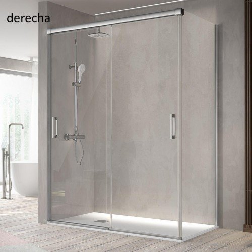 Mampara de ducha frontal, compuesta por dos hojas y las dos correderas más un lateral fijo, modelo Betty, para un plato que tengamos rectangular, con dos lados abiertos, esta mampara al poder abrir las dos puertas en formato corredera en el frontal, no nos ocupan espacio hacia fuera ni hacia dentro, y podemos entrar por el lado que queramos del frontal de la mampara.