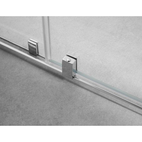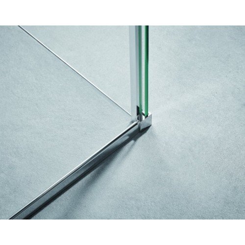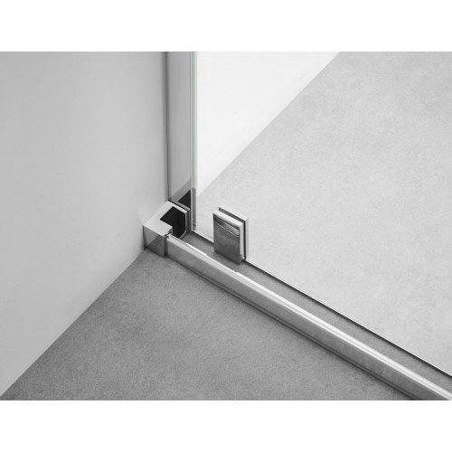 Mampara de ducha rectangular, formada por un fijo y una corredera más un lateral fijo, para cerrar platos de ducha rectangulares, con la L libre para la mampara, el modelo es Vitro Rectangular, este modelo de mampara se caracteriza por tener un diseño único, por la ausencia de perfilería superior e inferior y su innovador sistema de apertura mediante un brazo en acero inoxidable que actúa de guiador y soporte del fijo. Al mismo tiempo, el vierteaguas metálico guía a los rodamientos ocultos inferiores de la mampara, dándole un mayor protagonismo al cristal y a la sensación de amplitud. El modelo Vitro se caracteriza por sus perfiles minimalistas de líneas rectas y la ausencia de perfil superior. El brazo de sujeción es en L, con el brazo que sujeta el lateral fijo y acaba en la pared frontal.