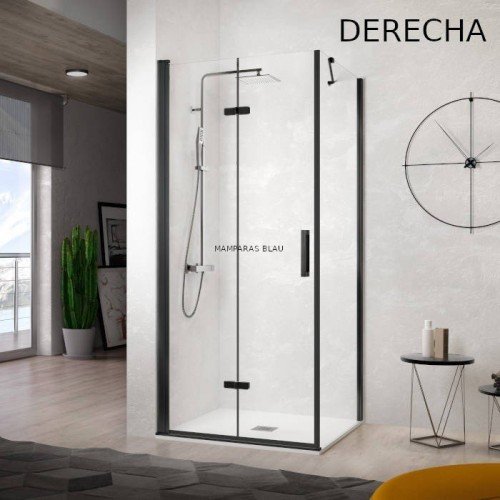 Mampara de ducha rectangular, formada por un frontal con dos hojas plegables y abatibles con bisagras entre las hojas, más un lateral fijo todo en negro mate, en el fijo lleva un brazo de estabilidad de 45 grados. Este modelo es fantástico para espacios pequeños en los que tenemos que cerrar un plato rectangular, que tiene dos lados abiertos, ya que el frontal tiene medidas muy reducidas, al poder abrir completamente, junto con el lateral fijo, para acabar de cerrar la mampara.