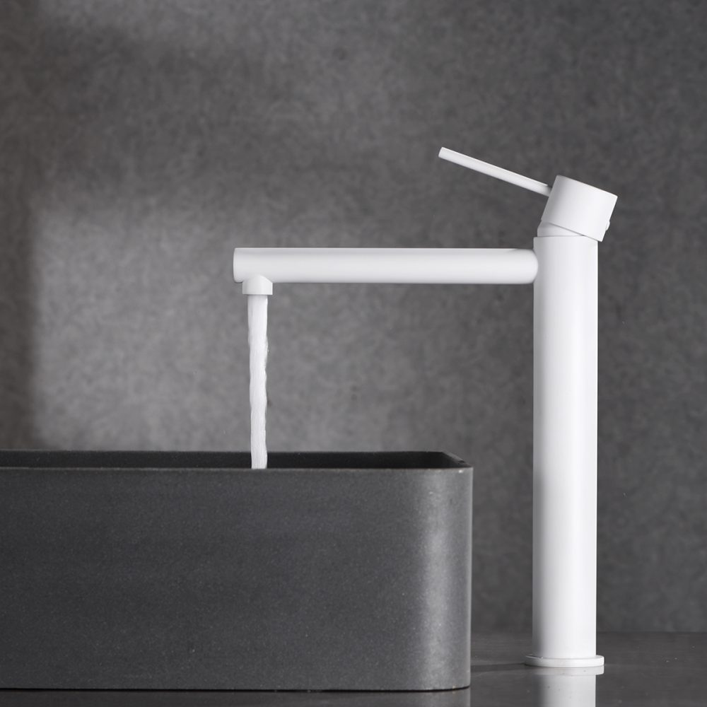 Monomando lavabo alto serie MILOS en acabado blanco mate, cuerpo de grifería de latón blanco mate, Cartucho cerámico Ø25mm, incluye latiguillos 3/8″