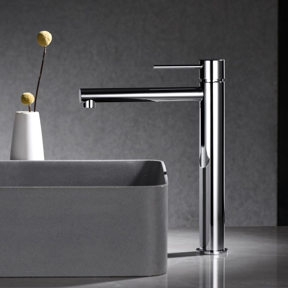 Monomando lavabo alto serie MILOS en acabado cromado, cuerpo de grifería de latón cromado, Cartucho cerámico Ø25mm, incluye latiguillos 3/8″