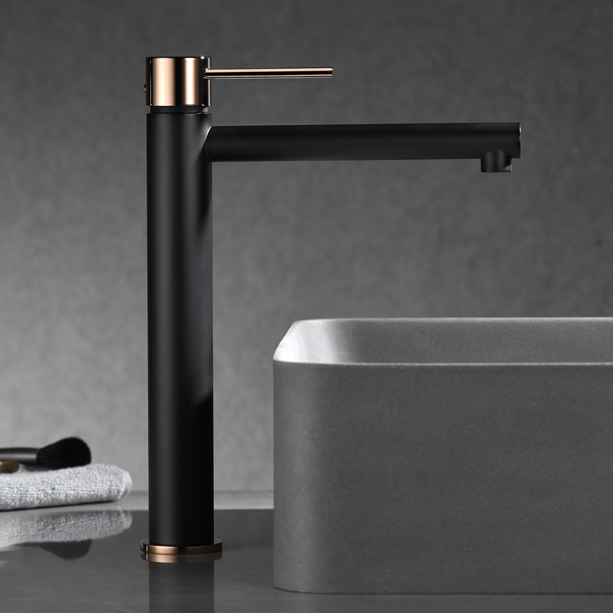 Monomando lavabo alto serie MILOS en acabado negro mate oro rosa brillo, cuerpo de grifería de latón negro mate, Cartucho cerámico Ø25mm, incluye latiguillos 3/8″