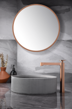 Monomando lavabo alto serie OLIMPO, cuerpo de grifería de latón, cartucho cerámico Ø26mm, incluye latiguillos 3/8″. Acabado oro rosa cepillado
