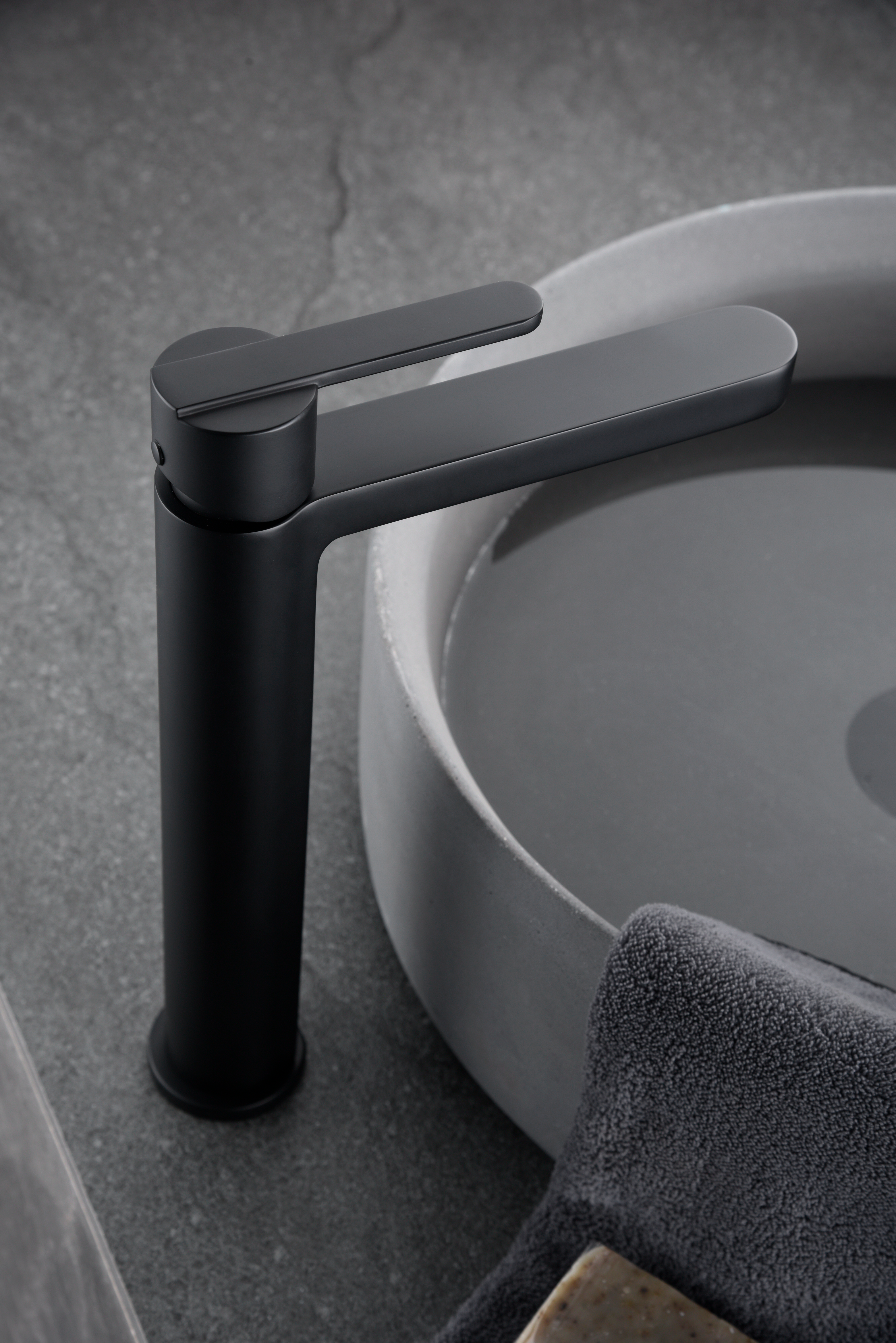 Monomando lavabo alto serie ROMA. Cuerpo grifería en latón. Cartucho cerámico Ø28mm. Latiguillos 3/8″. Acabado negro mate.