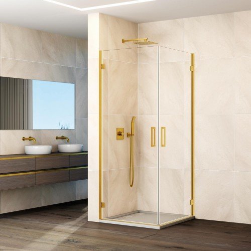 Mampara de ducha angular oro 2 puertas abatibles bisagras Glass 549,00€ - 698,40€Rango de precios: desde 549,00€ hasta 698,40€
