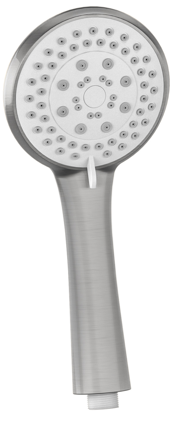 Alcachofa de mano de diseño amplio y redondo, con acabado en acero cepillado, ideal para un rociado de agua uniforme y de gran cobertura.