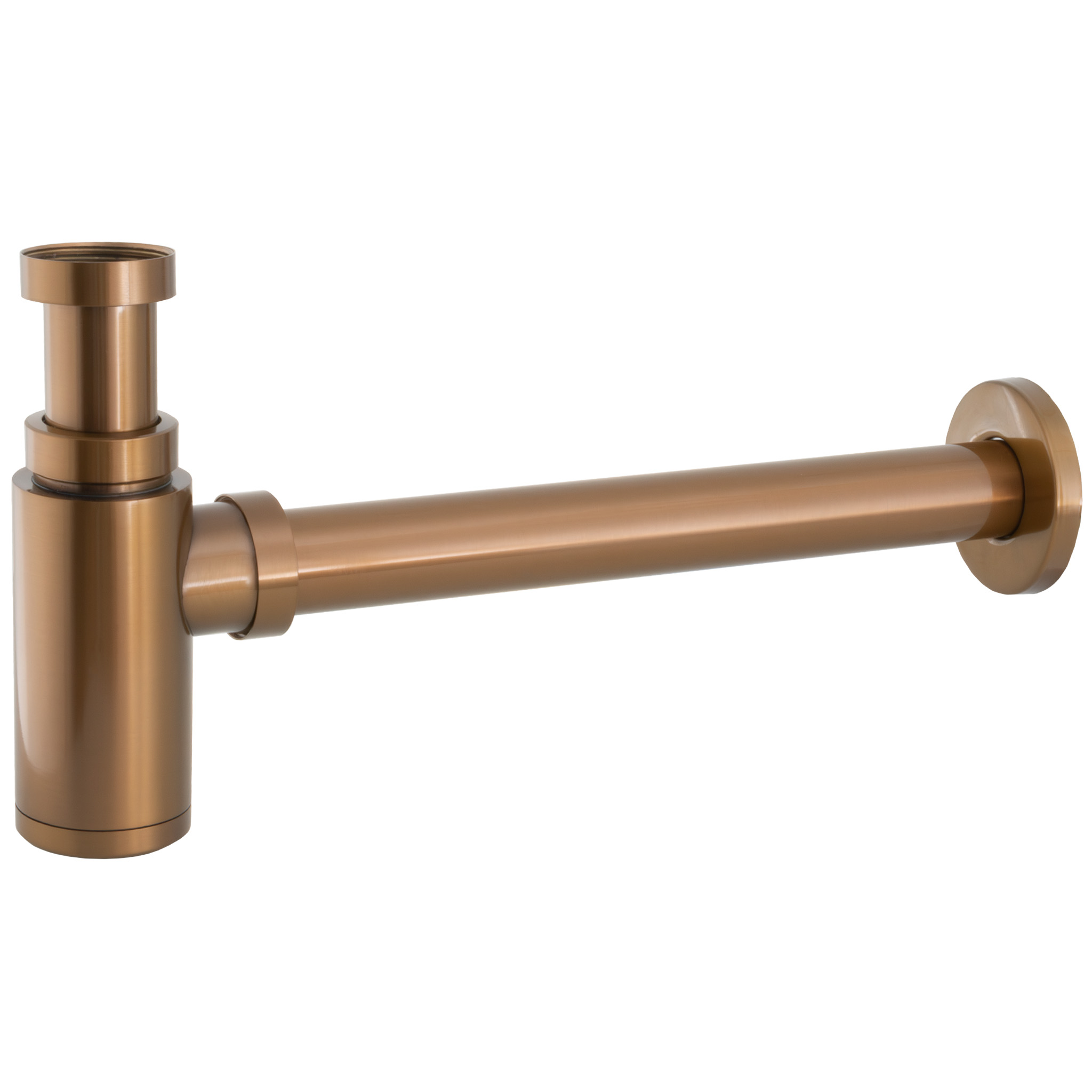 Este sifón de lavabo visto en acabado oro rosa cepillado es ideal para instalaciones donde el diseño y la estética son tan importantes como la funcionalidad. Su estructura redonda y elegante lo convierte en el complemento perfecto para lavabos suspendidos o con pie abierto, donde el sifón queda a la vista y debe integrarse con estilo en la decoración del baño.